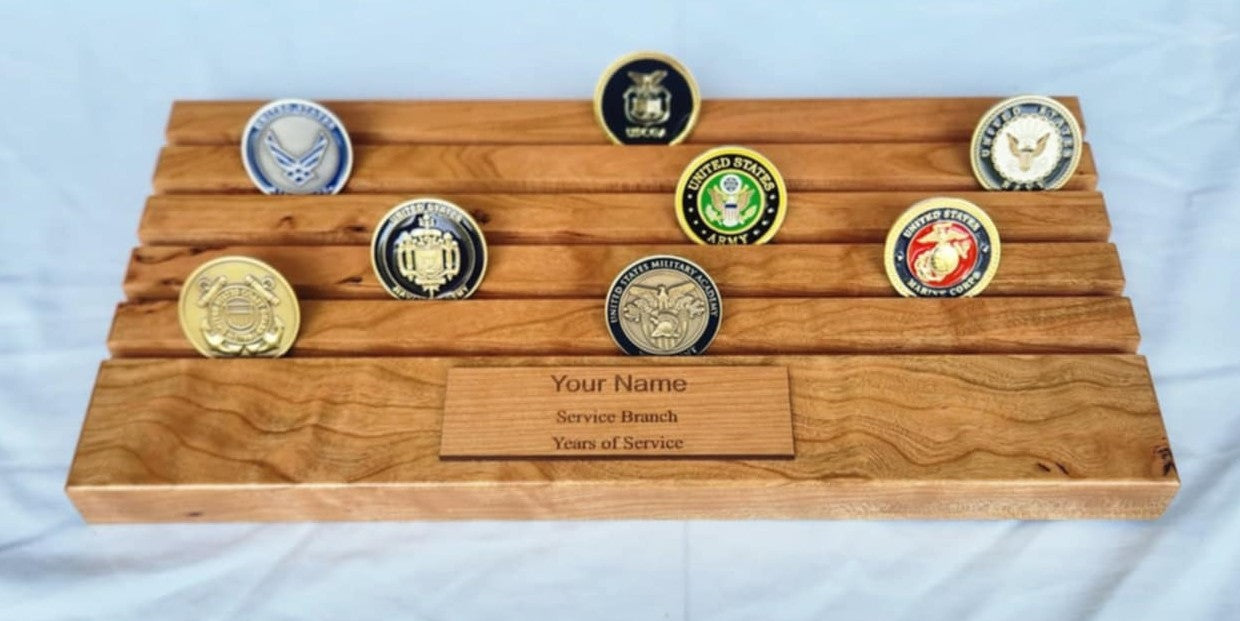 Tell your story of military service by proudly displaying your coin collection in this beautiful hand-crafted coin display made in the U.S.A.